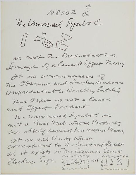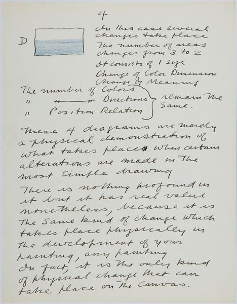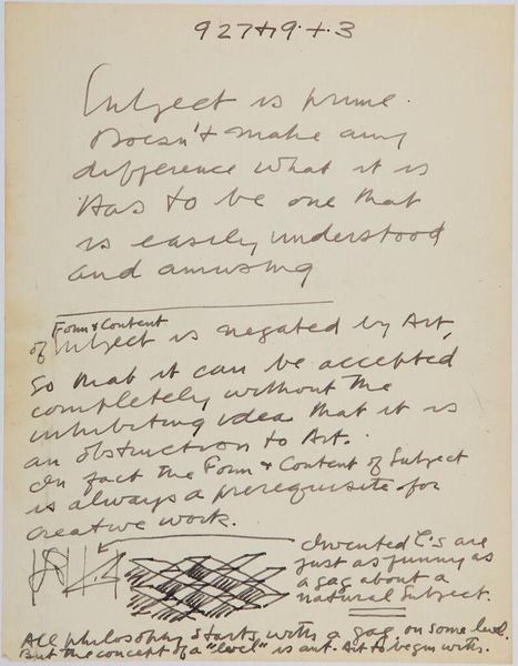 Editor: This page, titled "Art Theory Text with Sketches" by Stuart Davis, feels like a glimpse into the artist's mind. All these notes and scribbles, it's almost intimate. What strikes you about it? Curator: It's fascinating how Davis intertwines written language with visual sketches. He’s exploring the ‘language of painting’ as consisting of shapes, colors, and their relative positions, but insists the picture has emotional, ideological, and psychological meaning, too. Editor: So, he is thinking about the different layers of significance a painting might carry? Curator: Exactly! It's a reminder that visual elements aren't just formal; they're imbued with cultural memory and emotional resonance, like a visual echo through time. Editor: I never thought about sketches as holding so much meaning. I'll have to look at them differently now. Curator: Indeed. Every line carries its own symbolic weight.