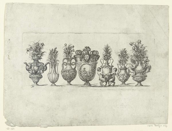 Editor: This drawing, "Vases of Judea" by James Tissot, from 1889, shows a selection of vessels rendered in pencil. They have such a simple composition. What can you tell me about this work? Curator: Note the meticulous attention to detail in rendering these everyday objects. We can investigate how Tissot elevates these humble vessels through his craft. He used pencil and photography, combining mediums – a blend of reproduction and artistic skill that requires scrutiny. What social or cultural significance might these objects have held for Tissot? Editor: That's an interesting point. The fact that he combined mediums shows such careful artistry. Is he interested in exploring themes beyond their functional use? Curator: Precisely. Let's think about production and value here. He depicts vessels of Judea—likely inspired by travels. We can consider how the process of documenting these objects is itself a means of collecting, appropriating, and ascribing value to a culture through artistic production and consumption. Tissot made a conscious decision to represent Judean pottery. Editor: It's interesting how choosing to draw these particular objects adds another layer to understanding his intentions, especially with the social context that you bring up. I see the value now. Curator: Exactly. Thinking materially opens paths of inquiry into cross-cultural artistic and social implications of his work. We are not looking simply at technique but the web of making, seeing, and using. Editor: I understand now. This focus on materials gives so much to think about. Thank you. Curator: My pleasure.