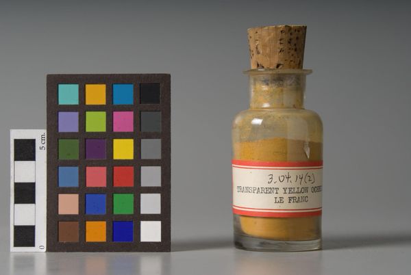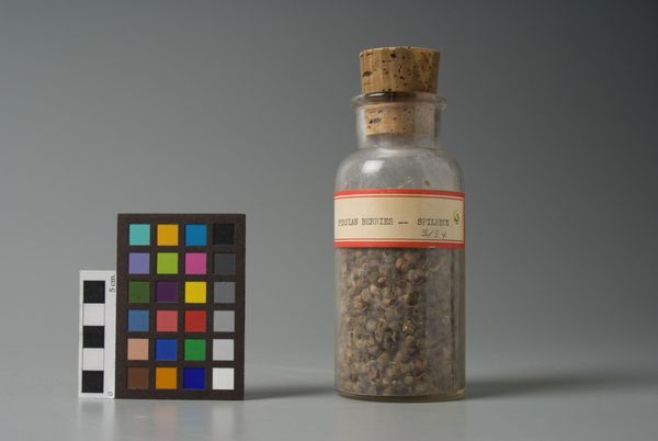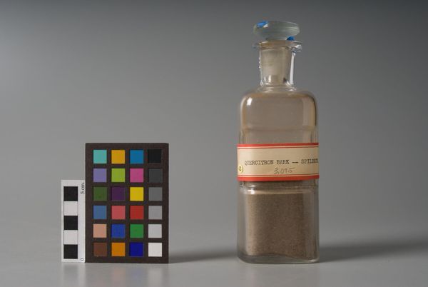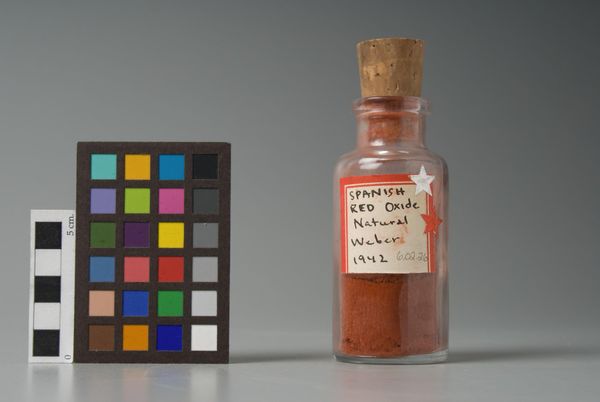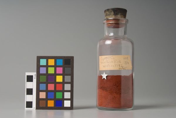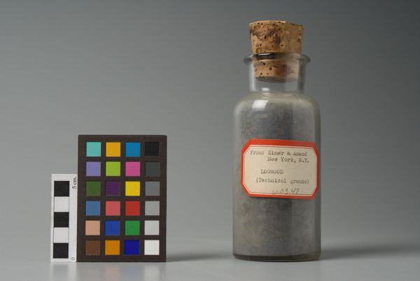 Editor: Here we have an image of "Logwood, Technical Ground" manufactured by Eimer & Amend. It's essentially a scientific photograph of a bottle and a color chart. What do you see in this piece, beyond its straightforward presentation? Curator: I see a layering of scientific intention. The logwood itself was a historical source of dye, a tool for artistic creation. But its purpose is now technical ground, a sample. What do you think that transition in purpose signifies? Editor: Maybe that even natural sources become standardized references? Curator: Precisely. Cultural memory is encoded in the remnants of past practices, even in this seemingly mundane scientific context. It highlights how the history of art materials influences our present understanding and use of color and technique. Editor: That’s fascinating; I never thought of it that way. Curator: Yes, seeing the cultural layers transforms how we appreciate its visual weight over time.