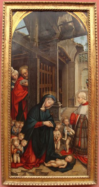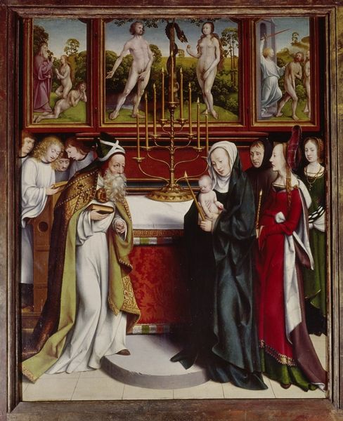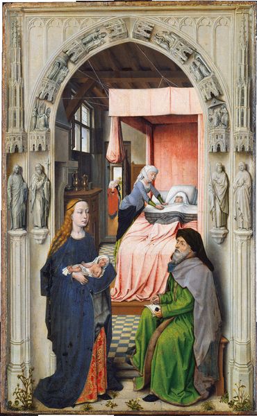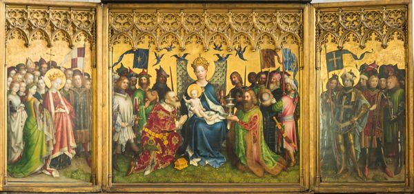 Curator: Before us, we have a remarkable "Triptych with Virgin and Child Enthroned," crafted by Jacomart, likely between 1448 and 1458. This tempera and gold on panel piece invites us into a world steeped in the aesthetics of the International Gothic style. Editor: My first impression is one of awe; the detail is incredible. There's something both serene and powerfully hierarchical about the arrangement of figures and the radiant gold backdrop. It feels... deliberately constructed for a specific socio-religious narrative. Curator: Exactly! Jacomart’s placement within the cultural and social tapestry of 15th-century Valencia reveals his role in constructing these narratives. He wasn't just an artist; he was a cultural influencer, shaping visual piety in an era of evolving political dynamics. How might this imagery influence the socio-cultural understanding of the divine? Editor: Absolutely. The left panel, featuring an imposing Saint Michael vanquishing a very cartoonish devil, positions masculine might as crucial for defeating chaos and "evil". Meanwhile, the Virgin, centrally placed, reinforces the era’s fascination of holy motherhood. There is a clear message about social roles and power dynamics that uses both religious allegory and what we now recognize as implicit political and societal instruction. Curator: And look at the supplicants surrounding the Virgin, their gaze fixed, almost desperate. They represent the human need for divine intervention but also, the Church's role in mediating access to the divine. This is a powerful image speaking volumes about the intersection of faith, power, and social standing. Who was its intended audience and how did that impact composition choices? Editor: The historical context illuminates its political and social function within religious art patronage, undoubtedly meant for the Valencian elite as a display of piety. This piece is not just beautiful but also strategically manufactured to reinforce social structures, dictating behavior, worship, and perception, all through an aesthetic lens. Curator: Indeed. Looking closely, we see artistic and cultural negotiation as it reflects the desires of patrons in relation to established visual traditions. Thinking about the role of public art, this triptych encourages questions about its cultural impact. Editor: Reflecting on this piece, I'm left pondering the agency of both the artist and the commissioner of the work, considering the work within systems of class and devotional obligation. It asks us: Who benefits from its message, and what alternative interpretations might exist outside its intended sphere of influence? Curator: Absolutely, and how relevant that interrogation remains for us, even today, when considering contemporary artists and their role in constructing our realities.
