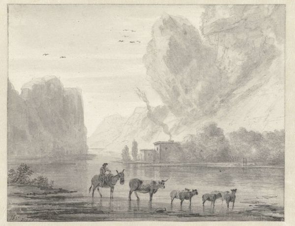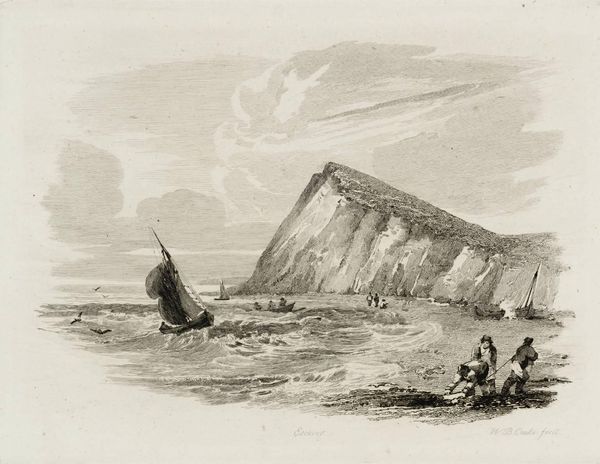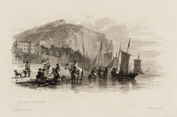 Editor: Here we have Luke Clennell's "Dawlish," a delicate print from the Tate's collection. It strikes me as a snapshot of everyday life, but with such a dramatic backdrop. What do you see in this piece? Curator: It's a dance between the monumental and the mundane, isn't it? The looming cliffs dwarf the figures, yet they persist in their daily labors. I wonder, do you feel a sense of vulnerability or resilience when you look at it? Editor: I think it's both, actually. The tiny figures seem fragile, but their activity also suggests a defiance against the imposing landscape. Curator: Precisely! And perhaps that tension is what makes it so captivating. It’s a reminder that even in the face of overwhelming odds, life finds a way to carry on. Editor: That's a beautiful way to put it; I'll definitely remember that.