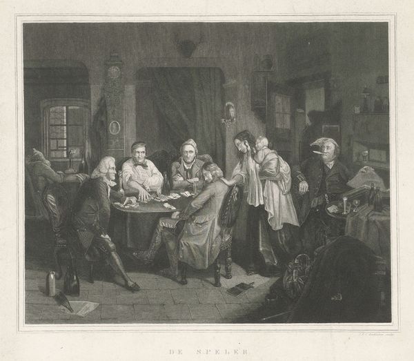Abraham Raimbach made this print, titled 'Interior with a company that has to pay rent' sometime in the late 18th or early 19th century. It depicts a crowded room where tenants gather to pay their dues, an event charged with anxiety and financial strain. The print offers a glimpse into the economic realities and social hierarchies of the time, reflecting the dependence of tenants on landowners. Note the varied reactions of the individuals depicted, from resignation to quiet desperation. Gender and age further complicate the scene, with women and children present, underscoring the widespread impact of economic pressures on families. Raimbach’s work reveals the emotional and social dimensions of economic transactions, reminding us of the human stories behind historical processes.