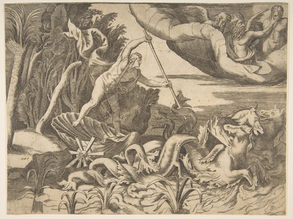 Léon Davent created this print, “Jupiter's Eagle Bringing the Water to the Styx to Psyche,” in the mid-16th century, a time when classical mythology was being reinterpreted through a Christian lens. Here, we see the story of Psyche, a mortal woman whose beauty rivaled that of Venus, and her arduous journey to be with Cupid, son of Venus. This scene illustrates a key moment from that journey. Tasked by Venus to fill a crystal flask with water from the River Styx, Psyche is assisted by Jupiter’s eagle. Davent's choice to depict this particular moment underscores themes of divine intervention and perseverance. Psyche’s narrative, though rooted in mythology, speaks to the struggles of women navigating societal expectations and the pursuit of love and recognition. The treacherous task set by Venus, and Psyche’s ultimate triumph, mirror the challenges women faced in asserting their agency in a patriarchal society. Notice how the image is shaped like a lunette; its form creates a sense of looking up, as if to the heavens, reminding us of the transformative power of love and determination.