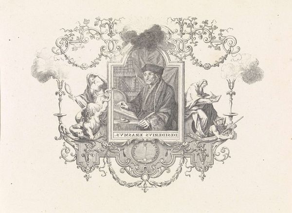Curator: Let’s turn our attention to "The Children of Mr. Neccair," an engraving created between 1746 and 1793. What’s your initial response to it? Editor: I'm struck by the sense of intimacy, almost staged, but the subjects feel posed within a circle, as if they’re being presented for our approval. And there's a distinct atmosphere of Rococo charm. Curator: Indeed. The circular frame dominates, and then note the textures achieved through the engraving—the delicate hatching creates a softness that is very intentional. It seems to mimic the smoothness of the children's skin. Editor: Absolutely. The Rococo period valued themes of childhood, domesticity, and playfulness. I see that reflected here in the family dog, itself a symbol of domestic loyalty. What also seems obvious to me is how the fashions echo class and status; they signal a level of access to resources. Curator: Yes, the very precise and elaborate costume details reinforce that sense of class and identity; for example, the girl in the back has a distinctly different composition and execution relative to the other two in the circle. Notice, too, the strategic placement of each subject—their arrangement guides our eye systematically around the composition, which itself sits against the background of rigid geometry. Editor: And perhaps the family name, should the work bear it, acts as a signifier for the children’s identities and destiny, their place within that rigid frame you describe? It reminds me of how much portraiture can communicate cultural values through visual language. Curator: Certainly. The engraving technique enables a broader dissemination of this image, democratizing the family's portrayal, which had previously been accessible mainly through painting. Editor: An interesting point. The decision to portray them with this level of finery freezes them in an aspirational pose for wider public viewership; almost as a demonstration of family prosperity. It’s as though Mr. Neccair had commissioned it to underscore status through representation. Curator: An intriguing possibility, given its placement within that matrix of Rococo style and social ambition. Editor: Exactly! This piece showcases not just family but also an image carefully curated to project prestige across the community.