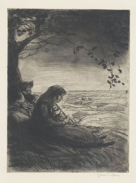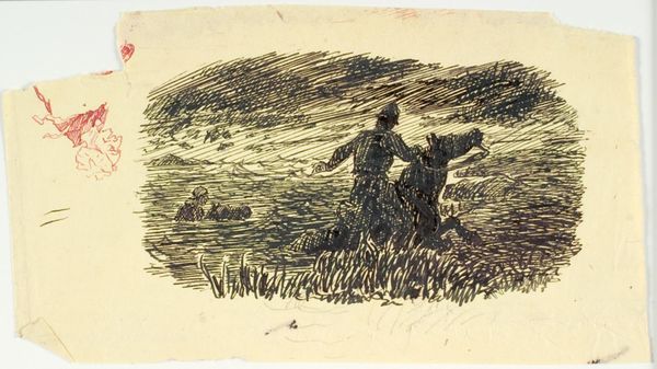 Editor: We’re looking at Fritz Syberg’s "Death Walks Away with the Child," a pen and ink drawing from 1901. The figure seems burdened, shrouded even, moving through a bleak landscape. It’s very unsettling. What can you tell me about this work? Curator: It's a powerful piece, isn't it? To understand its impact, consider the social climate of the time. The late 19th and early 20th centuries witnessed high infant mortality rates. Artists often grappled with these harsh realities. Syberg isn't just depicting a personal tragedy; he's commenting on a pervasive social anxiety. How does the imagery itself convey this, do you think? Editor: I suppose the way the figure almost blends into the landscape, the harsh lines… it's as if death is consuming everything, not just the child. Is the setting significant? Curator: Absolutely. The desolate landscape acts as a stage for this drama. Think about how art institutions – galleries and museums – shape what art is shown and how people understand it. Symbolism flourished during this era. How might contemporary audiences have viewed it when the work entered museums and the public consciousness? Editor: It probably felt very raw and real. Like a visual representation of a shared fear, but displayed with cultural permission. Museums validated those emotions by exhibiting such pieces, thus legitimizing them. Curator: Precisely. It’s a dialogue between art, social realities, and the institutions that present them. Hopefully that perspective gives us a fresh appreciation for this artwork. Editor: Definitely! I'm seeing it now less as a purely personal expression and more as a reflection of societal anxieties presented and solidified through established cultural channels. Thank you!