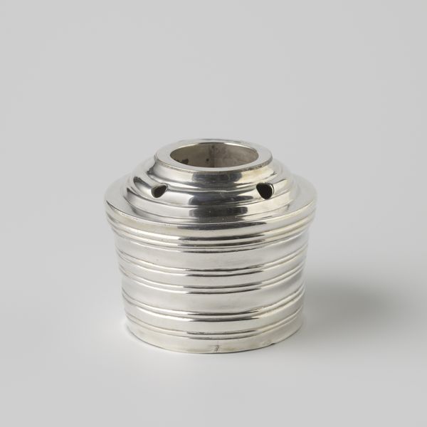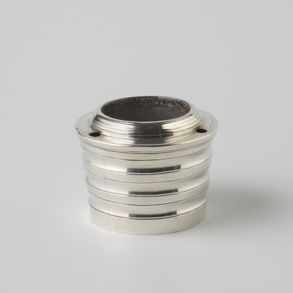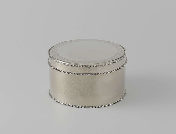 This unassuming tin was made by Fa. Diemont, a company, from an unknown date. Notice the material: it's not some precious substance like gold or silver, but humble tinplate, thin sheets of iron dipped in molten tin to prevent rust. This allowed for mass production, bringing metal containers within reach of ordinary people. Look at the simple, cylindrical form, subtly ornamented with a few parallel lines. The shape would have been stamped out by machine, a process that echoes the industrial revolution. The visual effect of the design relies on the contrast between the sheen of the metal and the crisp, regular lines pressed into the surface. There's real beauty in this object’s functional simplicity, but also a reminder of the labor and industrial processes that allowed it to be made so cheaply and efficiently. It’s a challenge to our traditional art categories, but a testament to the ingenuity of design and the social context of the everyday.