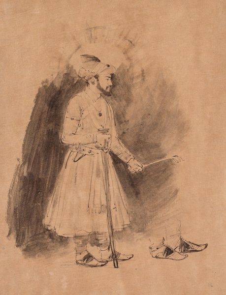 Editor: We are looking at "The Count of Palatino in the costume of a Palikar" by Richard Parkes Bonington, painted in 1826 using oil paint. The way the figure is presented—almost fading into the background—gives it a dreamlike quality. What do you make of Bonington's stylistic choices? Curator: Note how Bonington constructs form not through precise delineation, but rather through carefully considered tonal relationships. Observe the way the white of the Palikar's skirt interacts with the muted hues of the background. It is here, in the subtle gradations of value, that the artist orchestrates a compelling visual experience. What does the composition say? Editor: So you’re focusing on the use of color and form to create a certain feeling rather than focusing on historical context? Curator: Precisely. Note the texture achieved through the impasto technique, visible particularly in the highlights on the figure's turban and the folds of his garments. This imbues the painting with a tactile quality. Consider the interplay of light and shadow—how Bonington uses light not merely to illuminate, but to define shape and texture. Do you see the balance? Editor: I do see it now that you've pointed it out. At first, it just looked like a blurry portrait. Now I notice the more formal qualities in the work and that brings the painting into sharper focus. Curator: The composition’s structural integrity is upheld by the interplay between horizontal and vertical elements, which adds to the structural elements of Romanticism and Bonington’s unique aesthetic language. We moved past merely regarding subject matter and now appreciate its architecture of form and light.