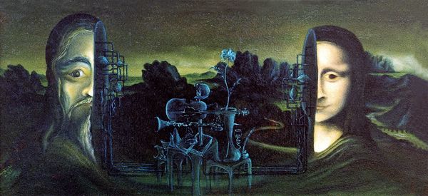 Editor: We are looking at "Untitled", an oil painting by Zdzislaw Beksinski. It's intensely dark, but it is mesmerizing nonetheless. It pulls you in! What can you tell me about it? Curator: This Beksinski piece arrests attention due to its compositional mastery. The interplay of vertical, organic forms – the pillar-like structures – set against the geometric severity of the background pyramid is intriguing. Notice how the artist’s tonal range is confined largely to somber grays and browns, yet punctuated with subtle chromatic variances in the light filtering through the sky and reflecting off the 'organic' formations. Editor: So you are saying that even if the colors are a bit drab, they are essential to its appeal and how we see form? Curator: Precisely. Observe also the texture Beksinski achieves with oil. The surface is visibly worked; built-up layers create palpable depth. In semiotic terms, we might read these textured surfaces as indexes of the artist’s labor, each mark evidencing his interaction with the canvas, while also being reminiscent of aged bone or petrified tree bark. The composition's perspective and implied pathway into the distance suggests a journey – but to where, and what awaits? These questions, are formal elements driving interpretation? Editor: You have given me an entirely new perspective for examining artwork like this; to go in-depth into how its material form is constructed is amazing. Curator: And, consider how a different artist's choices about technique or perspective might create a completely new interpretation from the same scene. Editor: That's really insightful. It makes you realize that details matter!