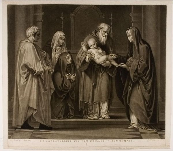 Curator: Standing before us is "Plutus, IV akt, 4. scene", a painting completed in 1814 by C.A. Lorentzen. It’s rendered in oil on canvas and currently held at the SMK, the National Gallery of Denmark. Editor: The composition strikes me as rigidly staged, almost theatrical. The muted monochrome palette gives it a serious, antique gravitas. Who are these figures, and why do they seem so…posed? Curator: The painting depicts a scene from Aristophanes' play "Plutus," the fourth act, scene four. In this comedy, Wealth, or Plutus, is healed of his blindness and restored to rightful vision, causing social upheaval. It's a symbolic critique of wealth distribution. Editor: So, that central female figure with the children…she’s a representation of society, guided and potentially corrupted by wealth? The children could represent innocence being led into a world changed by restored economic vision? Curator: Precisely! The woman, possibly symbolizing Equity or Justice, stands at the center, seemingly guided or presented before a council. Notice the council members – they are representative of Greek senators or playwrights offering judgements as Plutus looks on. They observe and deliberate the implications of this newfound wealth, some perhaps already scheming. And just behind them to the left you'll see a depiction of Zeus. Editor: Yes, the looming backdrop with Greek mythological figures seems crucial for providing depth, further highlighting this neoclassical fascination. But even within that backdrop, Lorentzen presents a dichotomy. Curator: Exactly. It reflects the broader artistic and political context of Neoclassicism. Artists often employed classical imagery to comment on contemporary society. What symbolic details strike you as particularly significant? Editor: I find myself drawn to the way Lorentzen employs the shadows. They deepen the folds of the robes, emphasizing the weight of tradition and societal expectations on the characters, specifically highlighting how easily corrupted we can be by a false image. Curator: That's insightful. These shadows give tangible weight to the intangible forces at play. The scene's almost academic realism is undercut by this highly symbolic interplay, isn't it? Editor: Indeed. Despite its initial impression of stern historical representation, it operates on an allegorical plane. The restored sight of wealth carries many burdens. Thank you for unraveling some of that here. Curator: A pleasure. There's always a push and pull between ideal representation and the human cost to such ideology.