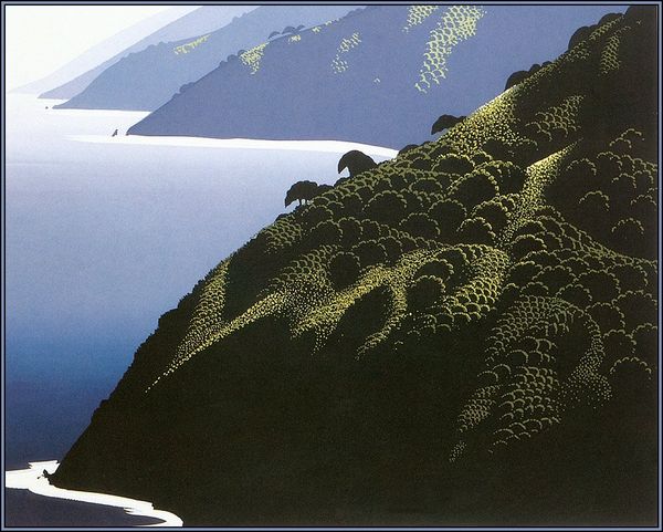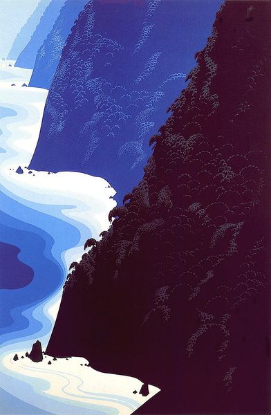Editor: Here we have Eyvind Earle’s *Gray Big Sur*. The stark vertical lines of the mountains meeting the horizontal lines of the ocean create a rather dramatic composition. What symbolism do you see embedded in this work? Curator: The simplified forms of the natural landscape, almost geometric in their precision, hint at the underlying structures that shape our world, both physical and psychological. The sharply defined edges could represent boundaries, both the boundaries of the self and the perceived limits of our world. Note the contrast between light and dark--the way the illuminated crests of the mountains stand against the shadowy depths. Do you think that suggests any kind of symbolic duality? Editor: Perhaps light representing knowledge and dark representing the unknown? I'm struck by how Earle flattens the perspective; there's an almost dreamlike quality to the image. Curator: Precisely! That flattening, and the almost ethereal light, invite us to consider this landscape not just as a physical location but as an interior space as well. Think of how landscapes often feature in mythology and folklore as reflections of our inner emotional states. What feelings are evoked by this landscape? Editor: A sense of both awe and perhaps a touch of isolation. The scene is grand, yet strangely empty of human presence. Curator: Consider how the Symbolist movement used landscapes to project emotional and spiritual experiences. This landscape, with its serene yet imposing presence, almost acts as a mirror reflecting our own internal landscape, the awe and quiet solitude we feel when facing something immense, the ‘sublime’ in nature. Editor: I see that now – the symbolism connects nature with human emotion. I didn't initially make the link, but it's quite clear now. Curator: Art invites exploration! These symbols and landscapes remind us that continuity and meaning is embedded in visual culture, memories transformed through shared human experience.