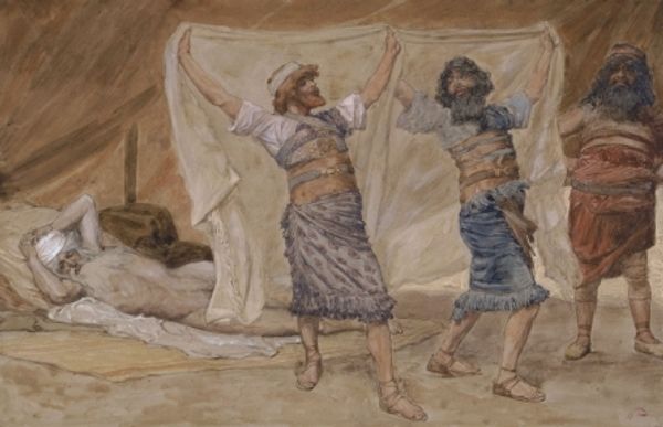 James Tissot made this watercolor called The Mess of Pottage, and it’s a real treat of understated storytelling. The colors are muted, almost like a faded memory, but there's something vibrant about the way Tissot handles the brushstrokes. You can almost feel the heat of the sun and smell the cooking pot as the artist describes the scene, using careful shading and muted, earthy tones to evoke a sense of place and atmosphere. Take a look at the way the figures are arranged, one hunched over the pot, the other, aloof and preoccupied. Notice how the bodies twist and turn in real space and how the artist renders form and mass with simple strokes of transparent colour, using layer upon layer of thin washes. This creates a sense of depth and dimension, drawing us into the emotional heart of the piece. Tissot had a knack for capturing these quiet moments. His work reminds me of later artists like Vuillard, who also found drama in the everyday. It shows you don't need grand gestures to tell a great story.
