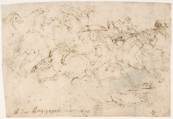 Curator: This sketch is entitled “The Judgment of Solomon,” rendered in pen, ink, and watercolor on paper, dating to sometime between 1624 and 1663, attributed to Francesco Allegrini. What catches your eye? Editor: Immediately, a certain drama. A life-or-death intensity, right there on the paper. Although the muted tones create this ethereal distance, it is an absolutely packed composition. You feel like you're in the thick of the conflict, witness to an event of significant proportion. Curator: Exactly, and I find myself pondering the expressions—can you decipher their feelings, the turmoil simmering beneath those finely sketched faces? Allegrini’s managed to convey this epic moral test, this knotty problem. And the characters feel timeless—they could be in the ancient world or…us. Editor: Oh, definitely. The Judgment of Solomon, even just sketched, makes us think about contemporary conflict. When you look closer, Solomon looks so cool and distant while everyone below him are the characters fighting. It forces us to ask; whose life and body is valued? Which is to be discarded and cut apart without recognition? Curator: He certainly invites that question. Now I can't help seeing Solomon's judgement as an old power move: performative in its cleverness and ruthlessly violent. I appreciate Allegrini’s capacity for a very dynamic staging. It reminds me, funnily enough, of those intense scenes in court dramas. Editor: Right, and isn’t that staging deliberate? Placing Solomon so high up, like a divine puppet master? He is completely detached from reality but is the character making decisions and impacts about lives, that's why I love how you said that is almost performative. The two characters in combat also have different representation of gender which adds layers of depth on the conflict. This work is far more disruptive than it first lets on. Curator: Disruptive. That is such a striking read of it! I do think there is room to ponder the violence of judgment. It also helps that the visual effect of the ink is so dreamlike and unsettling. Perhaps Allegrini hoped we'd be shaken enough to reassess our own certainties. Editor: Precisely. Leaving us less sure and far more thoughtful is what truly impactful artwork, I think, can achieve. And hopefully it resonates long after we leave this room.