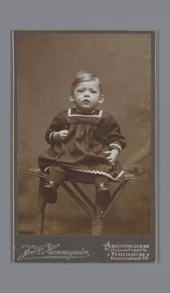 Editor: Here we have an antique gelatin-silver print, sometime between 1880 and 1900, called *Portrait of an Unknown Boy, Standing Beside a Chair*, by Hermanus Jodocus Weesing. I'm really struck by the melancholic feeling and formal rigidity. It seems staged. What stands out to you? Curator: The rigidity, yes, that speaks volumes. Imagine sitting still for what felt like an eternity back then! But beyond that pose, there's a poignancy to his gaze, a world-weariness in that young face that gets under my skin. Almost like he knows what’s coming! This image isn’t just a photograph; it's a captured moment of humanity and historical storytelling. Does the staging bother you? Or does it invite closer scrutiny? Editor: Well, knowing that the picture might be meticulously set, maybe both. What do you mean about his gaze knowing "what's coming?" Curator: That's just it, isn't it? Consider this, photography was still fairly young then; there's a performative aspect. Now, I see vulnerability behind that stare that seems universal to children throughout the ages, irrespective of what the future might hold for any of us. Are we seeing genuine angst or just interpreting how a young face feels about posing, trying to keep perfectly still? It’s delicious to ask! Editor: This definitely flips the perspective. I'll never look at old portraits quite the same way! Curator: Isn't it marvelous when art unlocks these new dimensions of perception and curiosity? We get the best of both worlds: that child's past merging with how that image resonates today!