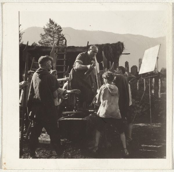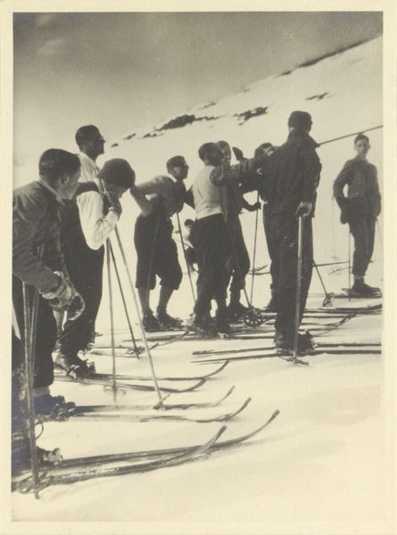 Curator: This photograph, "Skiers at camp--Sports," a gelatin silver print by Robert Frank, was likely created between 1941 and 1945. What stands out to you initially about this image? Editor: The high contrast and starkness are immediately striking. It's not a particularly inviting scene despite depicting leisure; there's something quite somber about the tones and the postures of the skiers. Curator: It is a fascinating contrast. While appearing somewhat documentary, the image's production and dissemination speak to the era’s complex negotiation of national identity and leisure activities amidst global conflict, especially as it found space in exhibitions meant to show Americans what was at stake at home and abroad. Editor: Right. The composition certainly contributes. The skis arranged like spears evoke a kind of preparedness and underlying tension. Do you think the skis symbolize this unspoken anticipation of wartime experience? Curator: Possibly. Looking at its stylistic echoes of social realism, it seems probable that Frank aims to evoke a certain ideal. These aren't just skiers; they're representative figures participating in activities associated with the physical fitness of a national body – not unlike works commissioned under the New Deal or Nazi projects meant to display fitness of mind and body. Editor: The arrangement and symbols feel so charged. And perhaps even more, this composition does feel like a symbol. The dark shadows on the snow read as hardship and resilience, key figures within the narrative of national survival. This connects very deeply to my understanding of national visual cultures and cultural iconography during periods of heightened sociopolitical unrest. Curator: Considering this context, I find the way Robert Frank presents the image incredibly profound. It's as if the snow is both an environment and a visual metaphor for the testing of both collective spirit and fortitude during this period. Editor: It leaves me with a chilling impression. Thinking about its place in time and understanding the symbols, it reveals a nuanced commentary that transcends mere documentation of a ski outing.