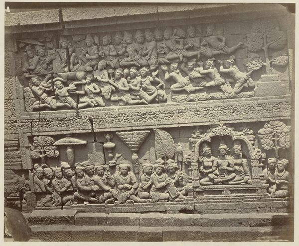Editor: This photograph, possibly taken between 1873 and 1879 by Isidore Kinsbergen, depicts a bas-relief on the eastern wall of Borobudur, printed on what appears to be aged paper. The monochromatic tones lend a solemn, historical feel to the architecture and figures portrayed. What strikes me is the careful arrangement of figures within the rectangular panels. What do you see in terms of its structure and form? Curator: Precisely. Observe how the artist meticulously organizes the composition, creating distinct registers that guide the eye. The balance achieved between the densely populated areas and the negative space is crucial. The horizontal lines formed by the ledges create a sense of order, almost like lines in a musical score. Editor: I see what you mean. It's like the artist used those lines to create rhythm. I'm also curious about the textures within the relief. How do the smooth and rough surfaces contribute to the overall image? Curator: Indeed, the interplay of textures is critical. Notice the contrast between the smooth, polished figures and the rougher, unrefined background. This juxtaposition emphasizes the three-dimensionality of the relief, further accentuating the narratives and scenes. Ask yourself what these choices convey about its overall artistry and the monument as a formal exercise. Editor: It is interesting how formal elements can inform one's appreciation of historical artefacts. Focusing on the arrangement, texture, and tones allows the photograph itself to be perceived as an object of interest in its own right. Curator: Precisely. Analyzing these inherent qualities lets us engage with this cultural document on a profound level.