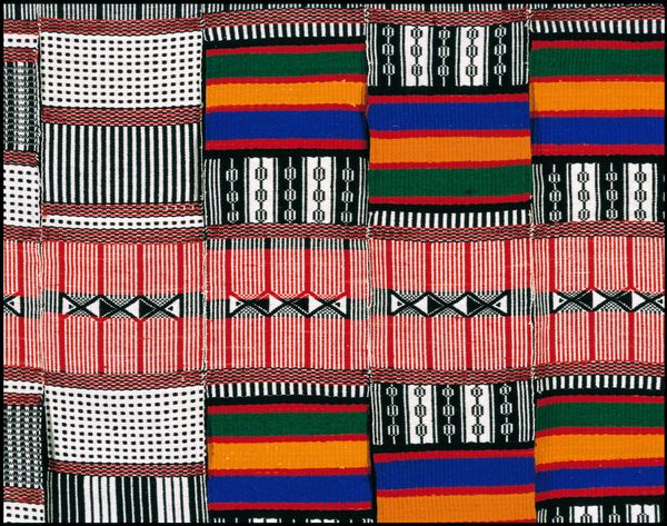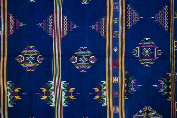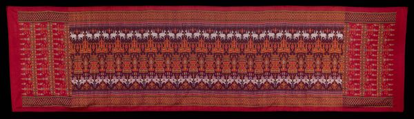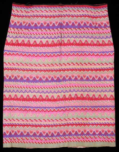 Curator: Here at the Minneapolis Institute of Art, we have a striking example of Maya textile art: a woman's ceremonial blouse, or "Huipil," crafted sometime between 1955 and 1960. Editor: It’s just overwhelmingly rich! I’m immediately drawn to the incredibly vibrant, almost aggressively saturated purple that dominates the ground. The eye keeps jumping across the surface, struggling to find a still point amongst all the visual activity. Curator: That constant motion is by design. "Huipiles" like this are not simply clothing; they are complex texts woven with cultural meaning and spiritual significance. Each pattern, each color choice carries a weight of tradition and communal identity. The weavers themselves are viewed as living conduits of memory. Editor: I notice how the geometric patterns—zigzags, dots, stripes—are arranged in horizontal registers. The color choices seem deliberate and contained. Is there any logic to how these patterns are ordered from top to bottom? Curator: Likely, yes. These designs encode history and cosmology. A specific village, lineage, or belief system might be immediately apparent to someone versed in that particular visual language. For example, a certain arrangement of zigzags could allude to mountains, rivers, or even specific ancestors. Editor: It’s intriguing that such rigid geometry can evoke something organic, but the constant interplay of motifs somehow softens it. I guess that contrast contributes to that overall lively sensation. The more you look, the more micro-variations reveal themselves within the stricter lines. Curator: Precisely. The beauty here lies not just in aesthetic accomplishment, but in the preservation and continuation of ancestral stories. The knowledge and skill needed to create these textiles is handed down through generations, linking the weaver to an unbroken chain of cultural expression. Editor: Thinking about this textile in isolation does a disservice to its embeddedness. It only begins to communicate when one acknowledges all the dimensions outside the visual structure – time, culture, purpose…it challenges that purely ‘visual’ engagement I automatically revert to. Curator: That’s the inherent power of these objects. They exist simultaneously as aesthetic artifacts and living testaments to a vibrant, ongoing cultural heritage. Editor: It makes one aware of the limitations when applying just one critical lens, doesn't it? Well, this has certainly expanded my way of considering surface appearances today!