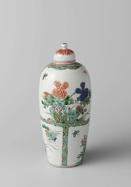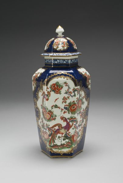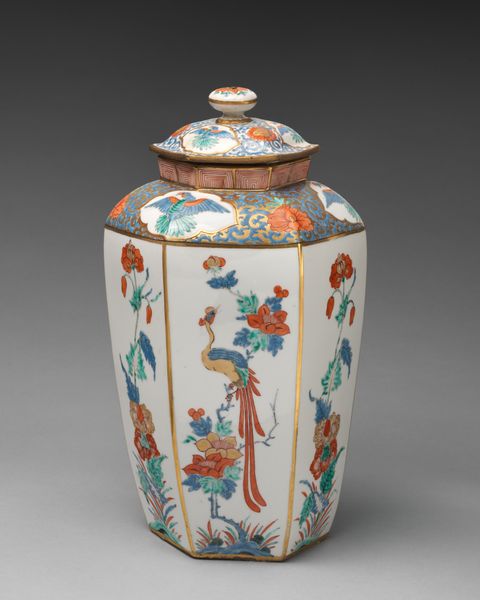 Curator: Well, hello there. The artistry we're about to explore is a feast for the eyes! This lidded jar, known as "Dekselpot", was crafted around 1886 by Petrus Regout, made with earthenware, a beautiful type of ceramic. Editor: Oh, I see what you mean. At first glance, it's intensely decorative; almost overwhelming. There's a vibrancy to the color palette. Curator: It really invites discussion, doesn’t it? The form itself speaks to me of craft and purpose. Looking closely, you can really appreciate the hand that shaped it. Editor: Yes, the shape is classic. The body seems built to show off its symbolic designs. I am captivated by the motifs, specifically the birds hidden amongst floral designs inside those medallion-like panels, almost mimicking Japanese porcelain art. Curator: Indeed, Regout clearly drew inspiration from Asian ceramics, reflecting the trend for Japonisme that was sweeping Europe. Notice the transfer-printed patterns; the application wasn't just aesthetic, but a conscious adoption of industrial techniques, making such items accessible to a wider consumer base. Editor: That's quite compelling; so, not purely decorative. Are the symbols intentionally Asian? Curator: I think so, though probably interpreted through a Western lens. It highlights the blending of cultures driven by trade. I see the materiality and method employed telling their own story of production and consumption, of a striving middle class in that time. Editor: You're making me look at this piece anew. Initially, it felt purely ornamental, even frivolous. But your material analysis lends it real cultural and historic weight. I start to see it not as simply pretty, but as a vessel that can tell so many stories! Curator: That is so true. It really shows that it can reveal as much about its cultural and manufacturing context as about individual taste and creativity. Editor: Agreed, understanding that it was shaped by forces of commerce and imitation truly adds new meaning. It will transform our appreciation of the piece! Curator: A wonderful insight indeed! Now, looking at all its sides, I realize this “pottery” bridges worlds – from East to West. What an enlightenment.
