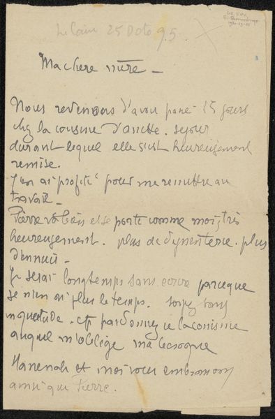 This is a letter by Emile Bernard to Héloïse Bernard-Bodin, made with ink on paper. What strikes me is the intimacy of it, how the act of writing becomes a way to think through ideas. The ink sprawls across the page, confident yet casual, like a conversation unfolding in real-time. There's a raw immediacy to the handwriting, each stroke bearing the weight of thought and emotion. The blue ink contrasts with the creamy paper, creating a stark visual tension. The words cascade down the page, some hurried, some deliberate. I can almost feel the pen scratching against the paper. It reminds me of Cy Twombly's scrawled paintings, where language and gesture merge. Like Twombly, Bernard embraces imperfection. The messiness only adds to its charm. It's a glimpse into the artist's mind, unfiltered and unadorned.
