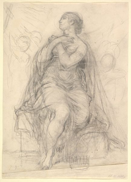Editor: We're looking at Toulouse-Lautrec's "Output Theatre," a pencil drawing from 1896. It's predominantly grey. The texture gives it an ephemeral quality; like a fleeting memory. What stands out to you from a formalist point of view? Curator: Primarily, I am drawn to the dynamism created by the use of line. Notice how the varying weights and densities of the pencil strokes define form and space. Observe, too, the interesting tension established between the sketch's apparent incompleteness and its cohesive representation of a scene. The gestural quality gives us a sense of immediacy. How does the composition strike you? Editor: The figures seem caught in a moment of private contemplation, almost voyeuristic. But it’s like we are peeking into a memory of an experience as much as experiencing a depiction. Does the sketchiness detract from its overall impact, or does it add to it? Curator: On the contrary, the sketchiness is vital. The use of "sprezzatura" or studied carelessness enhances its overall impact. Lautrec captures the essence of a moment without overly laboring. By doing this he achieves an evocative atmosphere and also subtly calls attention to the act of drawing itself. Note, for example, how the figures on the left contrast in terms of execution to the detail given to the possible statue on the right of the drawing. Editor: That is such a fascinating detail! It has definitely helped me appreciate how even a simple sketch can invite a deeper look at line and texture and composition, creating this whole atmosphere of a moment, a sense of 'sprezzatura'. Curator: Exactly. By closely observing such elements, one can unlock the rich complexity within this ostensibly simple work.