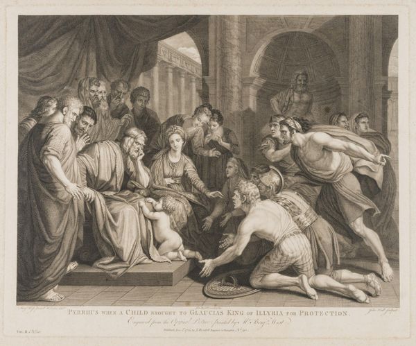 Editor: Here we have Pieter Franciscus Martenasie’s 1774 engraving, "Eteocles en Polynices, door hun moeder Jocaste tot vrede vermaand" or "Eteocles and Polynices, Their Mother Jocasta Urging Them to Peace". The composition feels very staged and theatrical, but the expressions on the figures' faces are compelling. What do you see in this piece? Curator: What immediately strikes me is how this image, seemingly about familial reconciliation, operates within a complex web of power, gender, and historical interpretation. Neoclassicism, the art movement to which this work belongs, often served as a visual language for the elite, reinforcing their values through carefully constructed narratives. How do we interpret Jocasta’s role here? Is she a peacemaker or a pawn in a larger political game played by men? Editor: I hadn’t thought about that. I was focused on her gesture, the way she seems to be pleading with her sons. Is Martenasie suggesting something about women’s roles in preventing conflict? Curator: Perhaps. But we need to consider the limitations placed upon women in 18th-century society. Jocasta’s agency is already circumscribed by her position as a mother and wife. The image presents a classical ideal, but classical ideals also carry heavy baggage regarding the subjugation of women and the justification of social hierarchies. Is Martenasie critiquing those roles, or is he reinforcing them? That ambiguity, for me, is where the image becomes truly engaging. Do you think the artist consciously questioned those roles? Editor: It's hard to say definitively, but considering those layers definitely gives me a richer appreciation for the piece. Thanks! Curator: Absolutely. Considering the power dynamics is how we move past simple aesthetic appreciation towards a deeper understanding of the artwork.