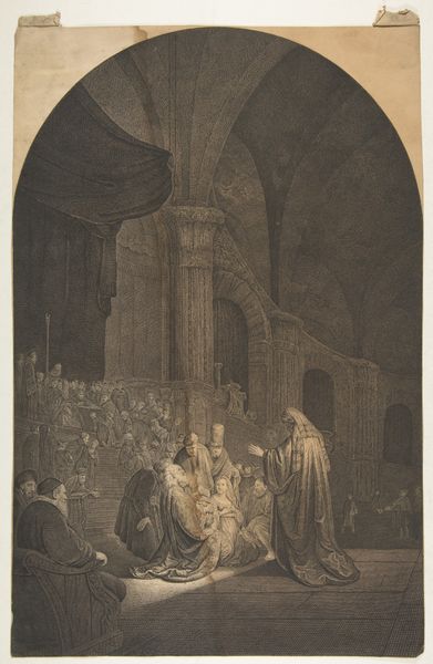 Editor: David Roberts’ watercolor, "The Shrine of Edward the Confessor," captures Westminster Abbey in a rather dramatic light. It's quite a somber scene, isn't it? How do you interpret the staging of this image? Curator: Indeed. Roberts presents us with a carefully constructed image, less about historical accuracy and more about evoking a sense of national identity. Consider the figures placed near the shrine – are they there to mourn, to admire, or simply to observe? Editor: That's a great question. I hadn't thought about their role beyond just filling the space. Curator: Roberts's image, through its careful lighting and staging, participates in a long tradition of representing British history and royalty, particularly for a public eager to consume imagery of national symbols. It reinforces the Abbey's role as a stage for national narratives. Editor: So, it's less about pure documentation and more about building a national story? Curator: Precisely. And understanding that helps us to see the painting's role within Victorian society's fascination with history and its construction of public memory. Editor: That’s fascinating. I'll definitely look at Roberts’ work differently now.