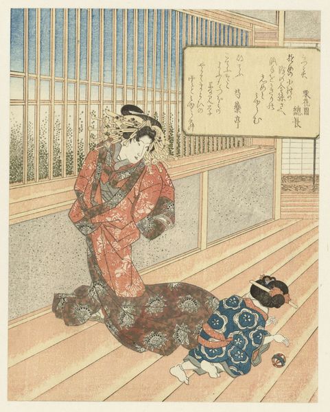Editor: This is Yashima Gakutei’s "Hannya Sutra," made around the 19th century, a woodblock print in watercolor and ink. I’m immediately drawn to the geometric patterns and the subdued, almost melancholy, color palette. How do you see the visual elements interacting? Curator: Focusing on the internal mechanics, we see a fascinating interplay of shapes and lines. Observe the rigid geometry of the screen on the right contrasting with the flowing, patterned kimono of the figure. This tension is further accentuated by the vertical lines of the blinds, creating a dynamic push and pull across the picture plane. What effect do you think that has on the viewer? Editor: I suppose that visual tension keeps the eye moving; there’s no single resting point. Curator: Precisely. And consider the layering of forms – the figure superimposed against the backdrop, flattened by the printmaking process. The artist utilizes line and color to create depth, yet simultaneously denies it, embracing the inherent flatness of the medium. It is a complex interaction between three-dimensionality and flatness. Note how the artist's intentional constraint shapes our experience. The lack of extensive shading flattens the composition to allow attention to the fine pattern work. Editor: It's amazing how much information can be conveyed even with such a restricted palette and technique. It gives off a certain sense of contained energy. Curator: Indeed. The artist expertly manipulates form and color to elicit this sensation of both restraint and vibrancy, illustrating how the materiality informs the narrative power of the image itself. Editor: I hadn’t considered that before, the way limitations can actually enhance expression! Thanks, I learned a lot. Curator: A rewarding exchange! Understanding how technique and form coalesce is pivotal to appreciate visual art.