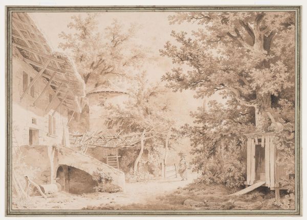 Curator: I find the drawing "Swiss Farm ('Hirtenhof')", rendered in pencil around 1827-1909 by Robert Zünd, to be particularly striking. Its almost monochromatic quality gives it a serene feel. What's your first take? Editor: Well, immediately I'm struck by the texture. The use of pencil creates such a tangible surface. You can almost feel the rough-hewn wood of the farmhouse, the grassy texture of the foreground, and even the soft, dense foliage of the trees. Curator: Absolutely. Zünd's precise and meticulous rendering speaks to his deep understanding and skillful application of the medium. I am particularly intrigued by how he translated the textures through subtle gradations of shading, especially considering this appears to be a plein-air sketch intended for future use. Editor: Right. Looking at it through the lens of labor, one must consider the hours spent, possibly outdoors, carefully transcribing the observed reality. The choice of pencil is significant as well. Its relative accessibility speaks to the democratization of artmaking—a break from strictly commissioned and high-art studio work. Curator: That is quite a valid perspective, bringing in questions of art's accessibility and production. Zooming back in, what I observe is how the formal structure emphasizes depth. Zünd's employment of atmospheric perspective is brilliant. Look how he utilizes blurring and lightening to give us a clear sense of spatial recession. It creates an almost idealized rural life. Editor: I’d agree. And beyond mere aesthetics, think about the social narrative implied. A harmonious depiction of rural labor—people seemingly content, chickens pecking, wood stacked neatly. It perhaps presents a curated vision of the Swiss pastoral lifestyle of the period, carefully crafted for a burgeoning art market hungry for images of idyllic landscapes. Curator: A valid consideration; but from a purely aesthetic viewpoint, consider the composition as a series of carefully balanced forms and planes. The house to the left, the trees on the right. Then you've got that carefully staged choreography between shadow and light. The artist utilizes the light not just for clarity but to suggest, even elicit, emotional engagement. Editor: Yes, but I cannot divorce that from how these landscapes were commodified, transforming rural scenes into desirable objects for urban consumption. Even the technique becomes part of this cycle. Think of the pencils, the paper… all commodities produced for this artistic enterprise, shaping, and reshaping our relationship to the very concept of "nature." Curator: True, seeing it through that economic lens is interesting. Well, I leave having a renewed appreciation for Zünd’s craftsmanship. The detail makes the farm so alive. Editor: I concur. I have come to appreciate the narrative this work unwittingly presents about consumption, production, and how we continue to reimagine our connection to the world through art.