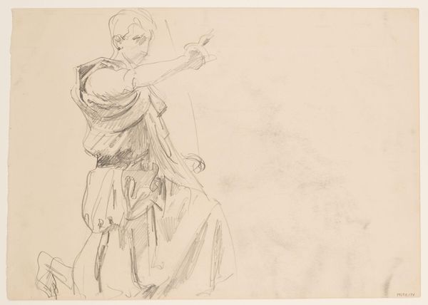 Editor: This drawing by Henry William Bunbury, titled "An Actress, Another Figure Behind," captures my attention. The delicate lines and the poised stance of the actress create a sense of theatricality. What stands out to you about the composition of this piece? Curator: The composition is indeed striking. Bunbury's use of line weight is noteworthy; observe how the actress is rendered with confident, assertive strokes, whilst the secondary figure dissolves into a mere suggestion. This contrast creates a visual hierarchy, emphasizing the actress as the subject, almost a study of form. Editor: That's a fascinating point about the linework! I hadn't noticed the shift in weight creating that hierarchy. Curator: Consider also the negative space surrounding the figures. It's not merely emptiness, but an active element that enhances the figures and their posture. The texture of the paper acts as an active element, emphasizing the material quality of the work. The starkness allows the audience to concentrate fully on form. Editor: I'll definitely pay more attention to the interplay of line and space going forward. Curator: Indeed, appreciating the elements allows a deeper engagement with the work, as we learn from the image itself.