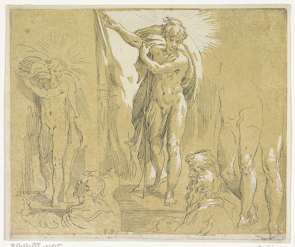 Curator: Today we are looking at Stefano della Bella's "Vulcan et Thetis," an engraving made around 1644, currently residing at the Metropolitan Museum of Art. Editor: My immediate impression is one of controlled chaos. There's a lot of energy conveyed through the hatching, yet the figures are rendered with an almost classical serenity. Curator: Precisely! Notice how della Bella employs line – pure, unadulterated line – to create volume and shadow. It's a masterclass in using negative space to define form. The composition adheres to the prevailing Baroque taste for dramatic tension, doesn’t it? Editor: Indeed. Look at Vulcan’s muscularity, defined by such precise strokes that evoke not only strength but the physicality of labor itself. It calls attention to the material and the act of creation; each strike of his hammer on the anvil reverberates through the network of lines. Curator: I'd also draw your attention to Thetis’s posture. She approaches, graceful, poised—a visual counterpoint to Vulcan’s raw energy. The contrapposto stance, borrowed directly from the Italian Renaissance, conveys movement and dynamism. The semiotic meaning of classical forms cannot be overstated. Editor: And look at the strewn armor at Vulcan’s feet! Remnants and refuse – objects shaped by and marked by physical labor. Are we meant to interpret this image not just as a scene of divine craftsmanship but also about labor's imprint? How would it be received in relation to craft during its historical era? Curator: Certainly, the image exists as a meditation on power, desire, and craftsmanship—all carefully balanced within a complex formal arrangement. The texture feels so considered here—the smoothness of Thetis' skin contrasted with the roughness of Vulcan's forge is brilliantly achieved. Editor: Seeing it that way deepens the work. Thank you for the fresh lens. Curator: A pleasure. Delving deeper allows us to admire it anew, doesn't it?