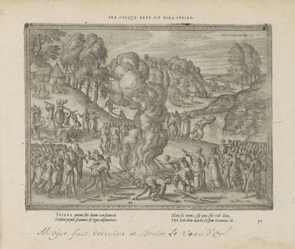 Editor: This is "Dina door Sichem overweldigd," or "Dina Overwhelmed by Shechem," by Pieter van der Borcht I, an etching and engraving from sometime between 1582 and 1613. It's quite a busy scene, with a lot going on in the foreground and background. The architecture in the back looks old, Roman almost. What do you see in this piece? Curator: I see a layered visual narrative, steeped in the symbolism of transgression and negotiation. Notice the stark contrast between the fortified city on the left, a symbol of established order, and the open landscape on the right, suggestive of vulnerability and exposure. The central figures being seized are pivotal; they are the immediate and visceral representation of a broken agreement. Editor: Broken agreement? I wasn’t sure what was going on between all those figures. Curator: Look closely at the tents and figures in the background; they represent the tribe of Jacob. Now follow the lines of sight and gestures. See how they converge toward the city. Van der Borcht is drawing our attention to the clash of cultures and values – an abduction that spirals into diplomatic and eventually violent consequence. Editor: So, the landscape isn't just scenery; it’s a stage for cultural conflict? Curator: Precisely! It becomes a canvas where honor, power, and familial duty play out. What emotional resonance does the depiction of Dina hold for you, considering the work's title and the era in which it was created? Editor: It’s interesting to think about how contemporary audiences would have seen this work, given how gendered and political it is. Now I'm really drawn to those details. Curator: Indeed! By deciphering the visual language of power and vulnerability, we gain insight into the historical attitudes embedded within this seemingly simple etching. A powerful testament to how images communicate cultural memory!