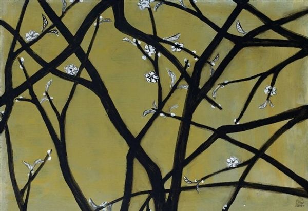 Editor: Alex Katz's "3 PM, November" presents bare branches against a pale blue sky. The starkness makes me think of winter, even a sense of melancholy. What do you see in this piece? Curator: The symbols are evocative. The branches, reduced to essential lines, suggest fragility and the passage of time. The blue reminds me of classical depictions of the heavens, a space of contemplation. Do the scattered leaves invoke a particular emotional state for you? Editor: I guess they make me feel like things are falling away, like a kind of letting go. Curator: Exactly. These painted fragments accumulate meaning. They connect us to cycles of nature, personal memory, and shared cultural understanding. A simple scene, yet rich in associations. Editor: I never thought about it that way. It is more than just a picture of branches. Curator: Indeed. It is a meditation on time, loss, and enduring beauty, isn’t it?
