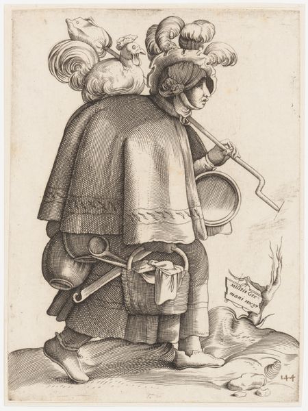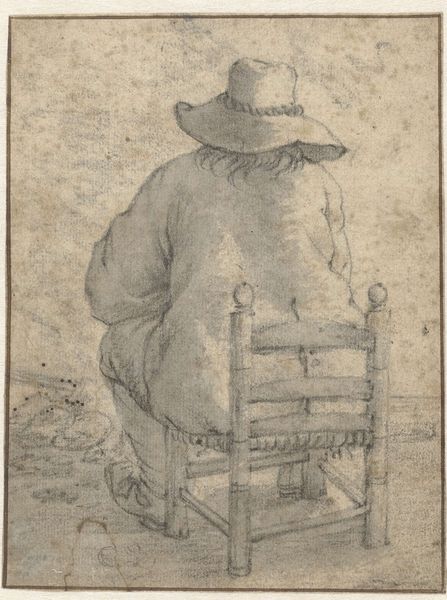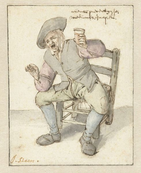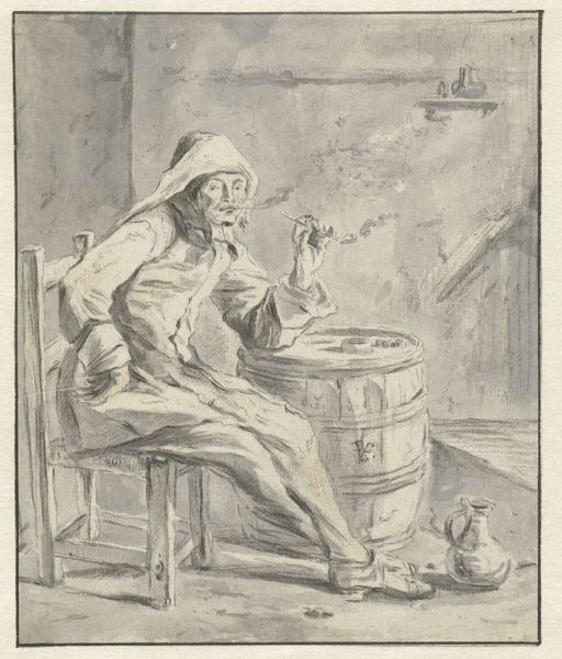 Curator: Cornelis Dusart, a Dutch Golden Age artist, created this intriguing piece titled "Peasant Smoking" in 1689, employing colored pencil and watercolor. It is a fascinating window into a specific social reality. Editor: It's striking how casually powerful it is. There’s a relaxed, almost weary energy to this figure, a silent narrative hanging in the air with the smoke. You can almost smell that tobacco and feel the rough texture of his clothes. Curator: The piece is quite relevant because it is from a period where genre painting became extremely popular. We have here a visual record, maybe idealized, of Dutch peasant life that really speaks about representation of class. Consider his clothes: they tell a story. What kind of commentary do you feel the work is doing, either on class, Dutch identity, or contemporary events of the time? Editor: He almost seems to be making fun of the upper crust without overtly doing it, like the wink you give someone at a party across a crowded room when a particularly pretentious pronouncement is being made. Look at the nonchalance. And is that a knife by his side? You see how society views manual work through this, right? Curator: That is interesting; let's talk about his portrayal. Dusart positions him so his gaze is down and to the side. What does that choice of composition say about power structures during this era? There may be, you know, multiple ways to interpret this depending on your philosophy and point of view. Editor: The downward gaze, the comfortable slouch... he's clearly a man rooted in his environment, confident in his own skin, and unconcerned with courtly pretenses. There’s something defiant in that utter lack of affectation. He is in his element; his expression seems to suggest his environment suits him fine. He may just feel very happy in this moment. Curator: This also aligns with contemporary discussions on masculinity and social roles. Genre paintings often played a part in defining these notions. This one shows how these types are observed, yes, but how were these characters actually living? Were these accurate reflections, or were these artists imposing stereotypes on their subject matter? Editor: It reminds me that in those days, the simplest pleasures—a smoke, a drink—were truly savored because life itself was harder. Curator: Yes, it offers us so much insight on labor, class consciousness and representation in art. Editor: Absolutely!