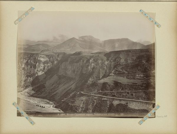 Editor: This is Dimitri Ermakov's "Mountain Landscape with Military Road in Georgia," an albumen print from around 1890-1900, currently held at the Rijksmuseum. The photograph has a stark, almost engineered feel. How would you interpret this work? Curator: I see this as more than just a landscape; it's a visual document of imperial power. The military road cuts through the Georgian mountains, signifying Russia's strategic and political ambitions in the Caucasus. Notice how the road is meticulously engineered, juxtaposed against the natural landscape, asserting dominance. What message do you think Ermakov was trying to convey? Editor: Perhaps to capture the modernization of Georgia? The road seems to be presented as a triumph of engineering. Curator: Indeed, but consider who Ermakov was. As a photographer working within the Russian Empire, his work often served as a form of visual propaganda. The construction of such roads wasn't just about progress; it was about controlling territory and moving troops efficiently. This photograph, then, might subtly celebrate Russia’s infrastructural achievements and, by extension, its colonial project. The absence of people is interesting, don't you think? Editor: It is. The focus is more on the landscape and this monumental road, a symbol of authority. Curator: Precisely. The landscape itself becomes a canvas upon which power is projected. Ermakov’s photograph isn't simply a scenic view; it’s a carefully constructed image that reveals the intertwined relationship between landscape, power, and photographic representation within a specific historical context. Editor: It is intriguing how seemingly neutral depictions can carry complex political messages. Thank you. Curator: My pleasure. Understanding art's socio-political context allows us to unpack its deeper meanings and intentions.