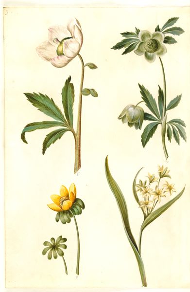 Hans Simon Holtzbecker made this botanical study of Aquilegia vulgaris, or common columbine, with opaque watercolour on vellum. The visual experience of this artwork is dominated by the contrast between the delicate, almost ethereal rendering of the flowers and the precise, linear quality of the stems and leaves. The colour palette is restrained, focusing on muted greens, whites, and purples, which evokes a sense of quiet observation. Holtzbecker's approach reflects a formal interest in capturing the botanical specimen's structure and detail. The composition isolates each plant against a plain background, drawing attention to its unique form and texture. This reflects the scientific observation and classification, focusing on a semiotic system where each element signifies a distinct botanical trait. The artist’s meticulous approach challenges any singular interpretation, positioning the artwork as a detailed engagement with natural form and visual representation. Note how this artwork uses precise rendering to explore the boundary between objective representation and the artist's interpretation, contributing to broader discourses on scientific accuracy and artistic expression.