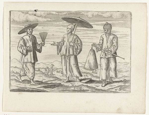 This anonymous engraving from 1596 shows us "Landlieden van achter Bantam," or countrymen from behind Bantam. It offers a glimpse into the social and economic context of early Dutch engagement with Indonesia. The image depicts two figures carrying goods, likely agricultural products, a scene referencing the Dutch presence in Bantam, a key trading port in West Java. Visual codes such as clothing and posture create meaning. The relative affluence of the figure on the left, compared to the figure on the right, speaks to hierarchies within the local population, and perhaps also between local people and colonizers. Historical associations with the Dutch East India Company are also relevant. The Company was a key player in shaping the social conditions of artistic production. Understanding this artwork requires archival research into Dutch colonial history, trade records, and ethnographic accounts to understand the complex interplay of power, commerce, and cultural exchange.