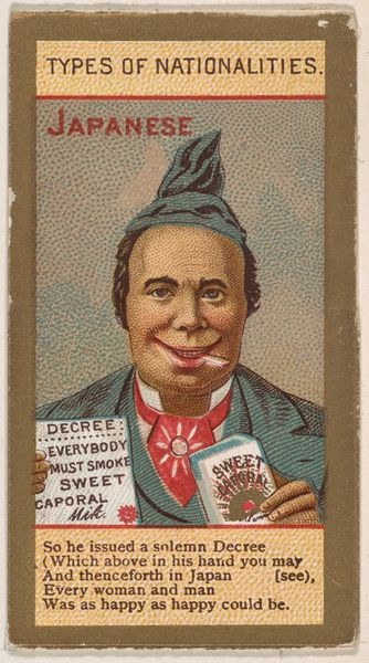 Editor: This small print, "Japanese, from Types of Nationalities," was created by Kinney Bros. around 1890. The subject's face appears rather solemn, almost imposing. How do you interpret this work? Curator: It’s fascinating to consider this image within the context of its creation. It stems from a moment of intense cultural exchange and, arguably, appropriation known as Japonisme, a period when Japanese art and aesthetics profoundly impacted Western art. Note the choice of representing a 'type' – here, a 'Japanese' individual. What symbols strike you most prominently? Editor: I guess the clothing seems significant? And the fan? Curator: Precisely. Clothing acts as immediate signifiers of identity and status. The details might hint at attempts to convey authenticity, though filtered through Western perception. Similarly, a fan isn't merely an object; it becomes a stand-in for notions of Eastern grace and composure. Editor: So, the symbolism flattens the actual culture? Curator: In some ways, yes. It becomes a symbol of Japan for Westerners, distilling and, inevitably, reducing the complexity of lived experiences and a sophisticated visual culture like Ukiyo-e to a few, easily digestible markers. This commercial card participates in constructing and circulating a simplified vision of the “Other.” Do you think the poem does a similar flattening? Editor: It seems like it. The Mikado aspires to be philanthropic, a benevolent man. That's… interesting, putting it mildly. Curator: Indeed. What's especially revealing is not just the image itself but what it tells us about the cultural biases and desires of its intended audience. The image's intent, in part, perpetuated stereotypes that reflect anxieties around rapidly shifting global power dynamics. It served, subtly or not, to 'define' the Japanese, so as to both market goods, but also establish cultural categories for a Western audience. Editor: I never would have considered all those layers. Thanks for highlighting what’s at play here. Curator: It's in these overlooked corners of history that we find the most compelling reflections of ourselves and our shared human story.