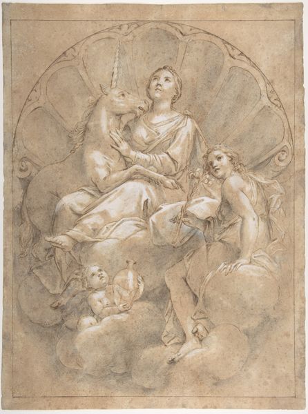 Curator: Here we have "Charity," a marble relief sculpture created around 1330 by Giovanni di Balduccio. Editor: It’s strikingly serene, almost ethereally white. The woman's upward gaze lends the whole piece a hopeful, pious feel. The texture seems smooth, cool. What was it like to see this when it was new, glowing white? Curator: Seeing this in its original context would indeed have been a powerful experience. Marble reliefs like these, situated within ecclesiastical spaces, reinforced societal values—in this case, the virtue of charity. Look at how the artist used gesture and inscription to create visual arguments of faith in the late medieval period. Editor: Inscriptions, yes, a scroll is right there—although the message has faded quite a bit, obscured. Her dress falls wonderfully though—simple, unadorned and pure white, the curves soft and sensual against the architectural grid. But let’s talk about the two children with her. What is going on there? The one she holds is almost deformed somehow…or damaged? Curator: Well, they were often presented with exaggerated features to highlight dependence on maternal figures, meant to underscore the virtuous acts of the central figure and those capable of providing succor. Charity extends from material goods to piety. Editor: Hmm, piety or guilt, perhaps. Does it show how the Church’s authority can intersect so directly in artistic representations, and how they manipulate emotional levers, maybe, to control wealth and power in the Republic? Curator: Yes, that touches on the intersection of religious, economic, and political forces that determined artistic patronage. This image served to shape and reflect civic virtues and beliefs about piety. It represents a larger system of symbolic communication during a time when visual imagery carried immense weight. Editor: A weighty burden indeed, carried in seemingly lightweight marble! Thinking about its social context has really brought it into richer, slightly uncomfortable focus. But a reminder—as many great art pieces do—that art, beauty, politics, power and beliefs, well, they’re all wound together pretty tightly. Curator: Absolutely, reflecting on that entanglement is vital. Thinking about artworks as a window onto the values and priorities of their time enhances our ability to understand not only the art itself, but the societies in which such compelling representations circulated.