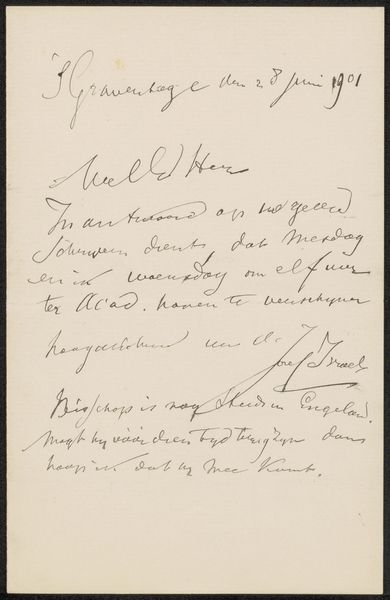 Editor: So this is "Brief aan W. F. Loman," possibly from 1892, by Jozef Israëls. It seems to be a pen and ink drawing. What strikes me is the personal nature of it—it’s a handwritten letter, the kind you just don’t see anymore. What do you make of a piece like this? Curator: Indeed. We’re looking at more than just a letter; we are encountering a portal to a specific moment in time. Handwriting itself carries a profound symbolism. Each stroke is unique, imbued with the personality, the emotions, and even the physical state of the writer at that instant. Consider the flow, the pressure, the flourishes… they’re all echoes of Israëls himself. Editor: That makes sense. I guess I was mostly focused on the words themselves, trying to decipher the handwriting. Curator: Precisely. Even the legibility – or, in some cases, the lack thereof – becomes part of the image’s symbolic language. It reminds us that communication was once a far more intimate, tangible act. There's an inherent slowness, a thoughtfulness that digital communication often lacks. How might this contrast influence our perception of the message itself? Editor: I see what you mean. The imperfections make it feel more human, more real. The letter almost feels like a relic, representative of a world before emails and texts. Curator: Exactly. And consider the very act of writing a letter – choosing the paper, the ink, carefully forming each word. What message does that action itself send? The letter isn't just words, but material culture. Editor: I hadn’t considered it that way. Thinking about it now, it’s like the whole act of creation here communicates as much, or perhaps even more than, the text. Curator: Indeed. And now when you think about it, aren’t letters visual echoes of both personal narrative and broad, shifting cultures? Editor: Definitely! It provides a valuable way to appreciate artwork!