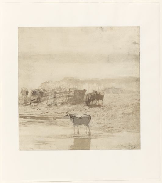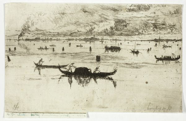 Curator: Otto Bacher's "View in Venice," created around 1880, offers us a glimpse into theFloating City through the meticulous process of etching. Editor: It has an ethereal quality, doesn’t it? Almost ghostly. The scene feels hazy and dreamlike, definitely more suggestive than explicit. Curator: The choice of etching certainly contributes to that effect. The fine lines created by the acid biting into the metal plate allow for a remarkable level of detail, but also a certain softness. You see how Bacher captures the reflections on the water, the gondolas gently swaying. It is a manufactured print but there is beauty in that technical mastery. Editor: Absolutely. Venice, even then, was heavily mediated. The picturesque views were not simply "found," they were consumed and reproduced as souvenirs, fueling tourism. Did the accessibility of etched prints reinforce or undermine traditional hierarchies of art and class? Was there also a new market opportunity there? Curator: An interesting tension there, certainly. Etchings like this made Venice and "high art" attainable to a broader audience, expanding cultural awareness, even shaping taste... Yet it still operated within certain established power structures, influencing how Venice and Venetians were viewed abroad. Think of the rise in popularity of photography too at that time. It becomes very democratised, even now! Editor: It is compelling to consider. These views of Venice, circulated widely through prints, not only captured a physical location, but also the burgeoning industries built around its representation and material production. Curator: So while seemingly quiet, this little etching reveals a complex story about the art market. I shall ponder on how it may influence some of my collection management choices, Editor: Exactly! And thinking about mass tourism, its rise, is relevant to almost every cultural context, don’t you think? I suppose for the public these art experiences serve as cultural memory markers now too!
