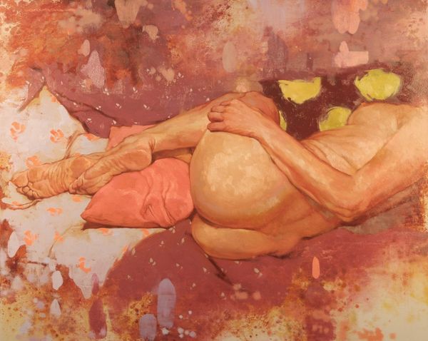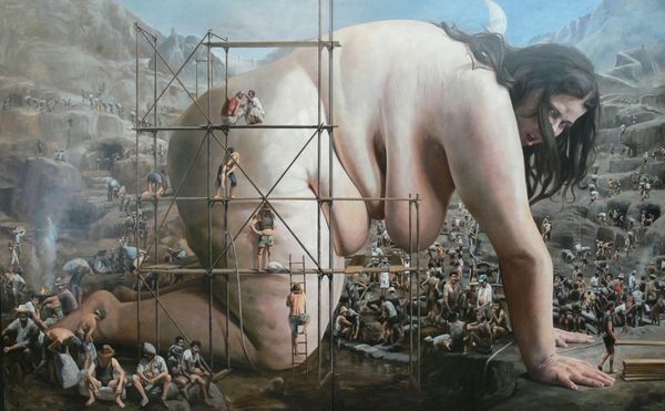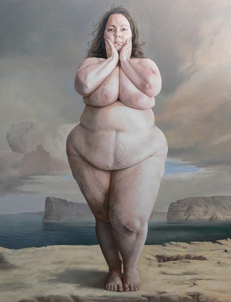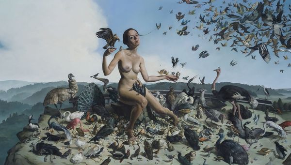 Curator: Rolf Ohst created "Der Verdacht"—"The Suspicion"—in 2016. Ohst works primarily with oil paint, often exploring themes of figuration in his contemporary works. Editor: Wow. Well, it hits you, doesn’t it? Stark figures, looming. The somber palette kind of reinforces the gravity of whatever unspoken tension hangs between them. A suspicion, indeed, like the painting's title suggests. Curator: Indeed. The title, I think, points us to read these two nude, bald figures and the ominous presence of the birds as emblems of contemporary anxieties surrounding surveillance, maybe also paranoia in the digital age. Note how their inward gazes accentuate this sense of inward-spiraling fear, this quiet introspection despite the presence of another. Editor: Yes, their eyes are both directed down and in, perhaps to that knot of birds at their feet? Almost like shame made manifest. You said surveillance...I wonder, are we, as the viewers, the surveillance in this case? Or maybe they suspect each other? It reminds me of some of Samuel Beckett’s plays, this tension. Curator: That's a potent point—Beckett is apt here. In terms of art history, the nude male figures could be seen through the lens of power dynamics. They aren't glorified or eroticized; there's an unidealized rawness to their form. What are they suspecting about themselves or, perhaps more tellingly, of their role? It demands this further reading of power and body politics that reverberates through culture. Editor: I keep thinking about that little murder of crows gathered there; are they weighing something, judging these two silent actors? Almost like their dark familiars, bits of their hidden inner selves, coming to roost. There is an undeniable feeling of dread present. Curator: Absolutely. It’s like the artist uses realism here but to arrive somewhere deeply surreal, philosophical even, as the very term “suspicion” is dissected and explored across these symbolic, corporeal, and ornithological forms. Editor: Thinking of my initial reaction... the work certainly burrows its way into your thoughts and feelings in ways I didn't anticipate. There's almost a physicality to how the ideas in the artwork manifest in one’s mind. Curator: Precisely. By looking at it closely and by allowing space to discuss these themes, we may better recognize our own vulnerabilities—we ourselves become “suspects”, perhaps.