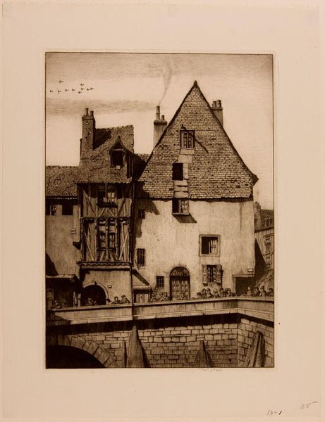Curator: Joseph Pennell, born in 1857, captured this remarkable "London from the River." Doesn't it just grab you? The detail is astounding. Editor: It does, but my first thought is how imposing the Tower of London seems, a stark reminder of its history of imprisonment and power. Curator: Absolutely, it's a looming presence. But also, note how Pennell frames it with the river traffic—working boats, not pleasure craft. Editor: Right, the river was a crucial artery for commerce, yet it also separated the city from the Tower's isolating might. Curator: It's almost like he's saying, "Here's the heart of London, the people moving and working, under the shadow of history." Editor: And it makes you consider who benefits from that history, and who bears its weight. A constant negotiation, then and now. Curator: A beautiful, melancholic observation of power. Editor: Yes, beautifully rendered and deeply unsettling.