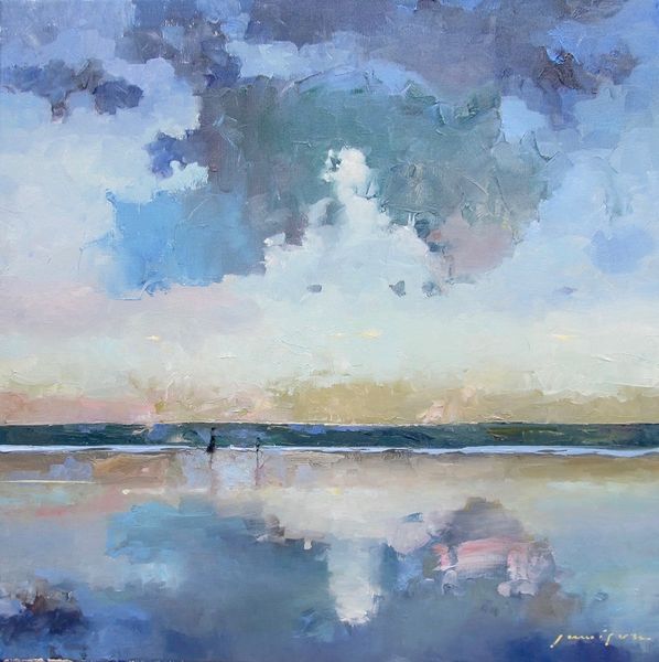 Curator: This is “Lake Dawn,” an oil painting in the plein-air style, attributed to Joseph Lorusso. Editor: The first word that comes to mind is ethereal. It's a study in soft grays and gentle pinks, a hazy, dreamlike state. Curator: Absolutely, but what intrigues me is considering the “plein-air” designation. This means it was likely painted outdoors, directly engaging with the environment. How might Lorusso’s experience of being present in that landscape impact the finished piece, versus painting from a photograph in a studio? Editor: That's a great question. I imagine it's about capturing the ephemeral, that very specific quality of light and atmosphere only present at that moment. It's as if he's not just painting a landscape but also the passage of time. Looking at the composition—the large expanse of the sky against the thin horizon line—the material quality of the oil paint almost feels secondary to its function. Curator: Interesting! For me, the emphasis on materials is always key. The texture achieved through oil paint becomes relevant. What brushes were used? What specific pigments allowed for such soft transitions? It evokes traditional landscapes, but painted likely more recently and by a living artist, who, perhaps, is marketing these traditional materials to an audience wanting a simulacra of a lost artistic style. Editor: A simulacrum, perhaps. But is that inherently negative? Look at how Lorusso layers the paint to evoke a sense of depth and atmospheric perspective. The colors may be muted, but the tonal range is surprisingly nuanced, drawing me deeper into the depicted space. Curator: I’m interested in knowing more about how plein-air landscapes continue to be marketed, and how those representations shift with popular culture as the artist makes it and as audiences encounter it. What contemporary meanings get layered onto this? How is value assigned to these artworks within a larger network? Editor: I see your point, but I also think the painting's enduring appeal lies in its capacity to evoke a sense of peace and quietude, separate from all those cultural considerations. Its power relies in the compositional balance, chromatic subtleties and the evocative potential in art. Curator: True. Still, unpacking the complex layers of production—from paint manufacturing to the artist’s labor to gallery representation—ultimately enhances our understanding, not detracts from it. Editor: Fair enough. Perhaps the enduring magic is precisely this interplay: what we feel, and what we come to know.