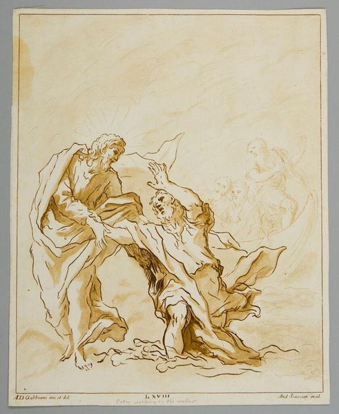 Curator: This is Michel II Corneille's drawing, "Rest on the Flight into Egypt", held here at the Harvard Art Museums. Editor: It's striking how the red chalk gives the scene an almost dreamlike quality, a warmth that softens the harsh reality of their journey. Curator: Yes, the iconography of the Holy Family taking refuge is a powerful symbol of resilience, often commissioned by religious orders to reinforce faith. The light breaking through the trees—it's no accident. Editor: Exactly! It's a visual metaphor for divine protection. The angel, too, suggests more than just rest; it implies guardianship. Curator: Though the artist isn't particularly famous, works like this provided critical imagery for the faithful. It reminds us of the church's role in shaping artistic production. Editor: And how these images, repeated and reinterpreted, solidify core beliefs and offer solace through familiar visual narratives. Curator: Precisely, a small drawing, but a window into a larger world. Editor: Indeed, layers of meaning revealed by seemingly simple images.