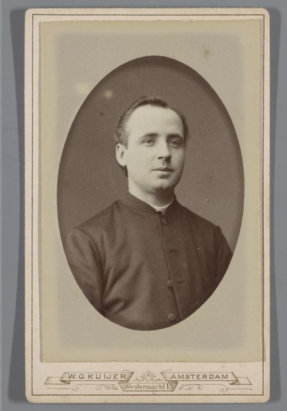 This is a photograph of an unknown clergyman by Albert Greiner, its date is unknown. Immediately, one notes the image's tonal consistency, dominated by sepia tones. The subtle variations in shading across the subject’s face and clothing create an almost dreamlike quality, emphasizing shape rather than detail. The composition adheres to traditional portraiture: the subject is centrally framed, his gaze direct but soft, fostering an intimate connection with the viewer. The light is diffused evenly, preventing harsh shadows and highlighting the smooth texture of the paper. However, it is the subject's direct gaze, combined with the limited tonal range, that challenges a reading of depth, flattening the image and drawing attention to its artifice. The frame itself is a critical element. Its metallic sheen contrasts with the subdued tones of the photograph, underscoring the artwork's status as a constructed object. This interplay between the represented subject and the material presentation invites us to reconsider how meaning is produced through the interplay of form and context. Ultimately, this portrait becomes not just a representation of a person but an exploration of the medium itself.
