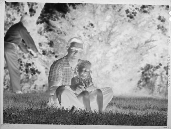 Curator: Lucian and Mary Brown captured this tender scene in their "Untitled" photograph, depicting a mother, father, and baby enjoying a day outside. Editor: It has such a haunting, dreamlike quality, almost as if it's a memory fading away. The inverted tones create a sense of distance. Curator: These family portraits, though seemingly simple, speak volumes about domesticity and societal expectations of family in mid-century America. The mother with the flower, the father ever-present. Editor: I'm struck by the performativity of the scene. Are they truly enjoying this moment, or is it a constructed image of familial bliss? It makes you question the role of photography in shaping our understanding of family life. Curator: Indeed. The photograph serves not only as a family keepsake but also as a cultural artifact, reflecting and reinforcing certain ideals. Thank you for sharing your insights with me. Editor: Thank you, that was lovely.