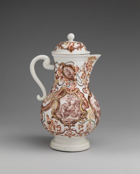 Curator: Well, this is a perplexing piece. A stoneware teapot conceived by George E. Ohr between 1894 and 1903, presently housed at The Met. What springs to mind for you? Editor: Intrigue, and a dash of unsettling wonder. The dimpled texture, the almost flesh-like tone, even the serpent-headed spout…it's more organic than ceramic, almost alive. It really pushes the boundaries of what we expect a humble teapot to be. Curator: Indeed. Ohr's work intentionally disrupted conventional expectations, challenging the formal constraints typically imposed on functional pottery. His embrace of imperfection was a pointed commentary on mass-produced, commercialized ceramics of the late 19th century. He fashioned himself as a singular artistic figure. Editor: The spotted surface almost appears diseased but also hints at seeds and germination—an interplay of beauty and decay. This color especially, in all cultures, holds very deep symbolism with ideas related to love, romance, joy, and anger! It is a lot to hold in a simple household object. Curator: Exactly, it carries considerable weight in this design! And Ohr wasn't merely interested in aesthetic innovation, though there's plenty here. The very act of hand-crafting each piece, deforming the clay to his own expressive ends, was an argument for the value of the individual artisan in a rapidly industrializing world. This was an expression of independence! Editor: I see. There’s definitely an untamed, almost primal quality, wouldn't you agree? It feels almost deliberately awkward in form, like it resists easy consumption or idealization. Curator: That's precisely the point. Ohr’s ceramics rejected prevailing Victorian sensibilities of order and restraint. He sought to provoke, to challenge viewers to question the role of art and craft in society. Its current display, of course, within the MET, also contributes to this dialogue by assigning historical value. Editor: So, it seems even a seemingly straightforward teapot can carry a rather complex historical message? Curator: Absolutely! Ohr’s legacy serves as a reminder of art’s capacity to ignite social, cultural, and artistic transformation—and he left quite a paper trail explaining his goals and methods! Editor: A peculiar object of everyday life and its historical reflection. This teapot embodies complex symbolism—certainly more than meets the eye.