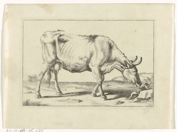Curator: This engraving, titled "Schaap naar rechts / Staande koe in het water," was created by Wouter Johannes van Troostwijk between 1792 and 1810. It resides here at the Rijksmuseum. Two studies appear within the print: a sheep above and a cow below. What strikes you first about this diptych of barnyard creatures? Editor: The sheep is upside down. That throws me for a loop! It's as though I am meant to view it that way, but my brain resists. I find my eyes lingering there, while the cow feels more… ordinary? And oddly substantial given the bare linework. Curator: That sheep certainly grabs your attention! It makes me think about the role of these kinds of studies. Troostwijk created them to develop his skill in depicting the natural world. The poses perhaps reveal his process, or maybe showcase the versatility in his repertoire. What function might these animal forms have served at the time, within society? Editor: They seem simple, direct and maybe a little bit humble; like the kind of honest rendering of things that feels both necessary and fleeting. I see a world where it's important to document the appearance of animals accurately—essential forms, essential resources. And there's a sensitivity there, in how the animal occupies the space. Did the artist create studies of them outside, from life, do you imagine? Curator: Troostwijk's larger body of work reveals his focus on landscape art. Given the period, it is reasonable to consider his immersion in the pastoral environment outside the city and, based on the fine details within this image, I find it quite plausible to suggest he might have made observational studies from life in preparation for this or other works. Also, these kinds of images served as vital forms of visual communication and education—essential knowledge in an agrarian society. Editor: Knowing all that... now I sense the print as a window into the past, not only viewing form but glimpsing this shared experience. Thank you! Curator: A productive perspective. Indeed, exploring the purpose and cultural context of such images enables a deeper connection to this Dutch master’s era.
