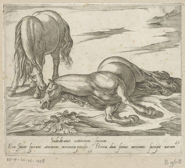 Antonio Tempesta created this engraving, "Staand paard van achteren gezien," sometime between 1576 and 1630. During the late Renaissance, the horse was not merely an animal; it symbolized power, status, and virility within the aristocratic echelons of European society. Here, Tempesta seems to play with the traditional representation. We are offered a view from behind, complicating the power dynamic, almost as if to subvert the male gaze. The horse is poised and muscular, yet there's also a sense of vulnerability, as its hindquarters are exposed. The Latin inscription at the bottom adds another layer, hinting at the horse's strength and spirit. This work prompts a consideration of the intersections between power, masculinity, and the natural world. While it celebrates the animal's physical prowess, it also invites us to reflect on the cultural values we project onto these magnificent creatures and, by extension, onto ourselves.