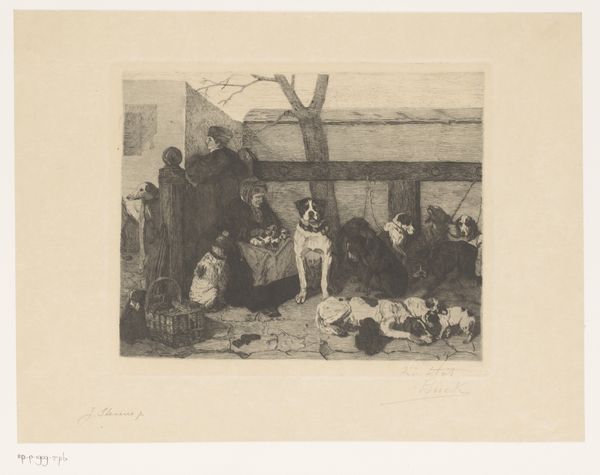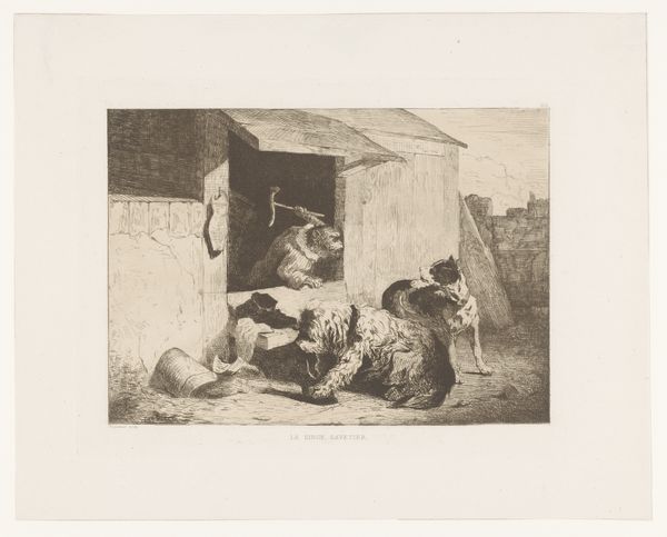 Albert Heinrich Brendel created this etching titled 'Interior of a Sheep Pen' in 1884. Made in a period of burgeoning capitalism and shifting social structures across Europe, this work seems to offer a glimpse into the rural realities of the era, and possibly, an idealized vision of nature's harmony. The image presents a densely packed sheep pen, filled with animals at rest and feeding. The setting seems far removed from urban life and its discontents. Brendel's choice to depict this scene may hint at the cultural fascination with the rural world amid industrialization. Was this depiction simply a record, or an allegory of social cohesion? Was it an attempt to address the concerns of an art market increasingly distanced from agricultural life? To understand this work fully, one would need to delve into the art criticism and market dynamics of late 19th-century Europe. What role did pastoral imagery play in the broader cultural landscape? This art invites us to explore the values and anxieties of a society undergoing significant change.