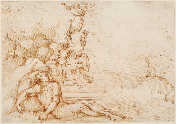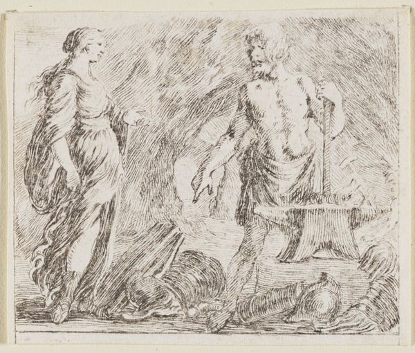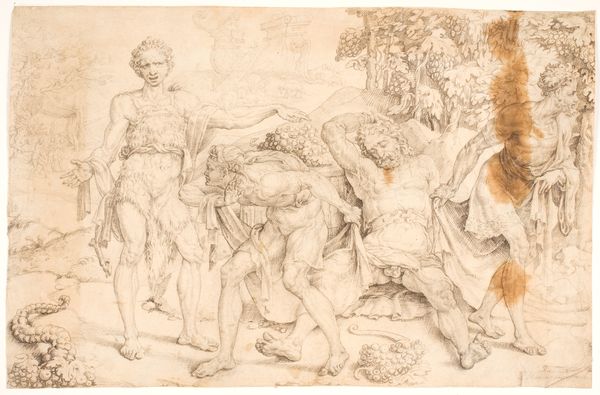 Editor: Here we have "Peace Protecting the Arts from the Ravages of War," a drawing by Heinrich Dittmers, created sometime between 1625 and 1677 using pencil and charcoal. I find it compelling how the figures are so dynamic, almost caught in a moment of desperate action. What can you tell me about this piece? Curator: This drawing resonates with the age-old struggle between creation and destruction. Look at the figures: the ravaged "war," full of frantic energy; the calm, protective "peace"; and the kneeling figure who embodies "the arts." Each represents not just a physical form but a powerful symbol, echoing narratives passed down through generations. Editor: So, it's an allegory? How would someone at the time have understood the symbolism? Curator: Precisely. The symbols were very common in the period. The frenzied figure of war would have represented not just conflict, but the chaos and destruction of established order and cultural treasures. "Peace," with its placid form, is acting as the protector of something fundamental to society and civility. Editor: And the kneeling figure? Curator: Notice how the "arts" almost recoil, seeking shelter. Consider the historical context; Dittmers was creating this during a time of intense religious and political conflict. It speaks to the fragility of creative endeavor amidst such turmoil. Do you see any echoes of these sentiments in contemporary art? Editor: That's a really good point. I see how the symbols of peace and destruction remain so relevant today. I will look for allegories and appreciate those elements more! Curator: Indeed. Symbols can hold enduring power and speak volumes about cultural anxieties and aspirations. They connect us across time.